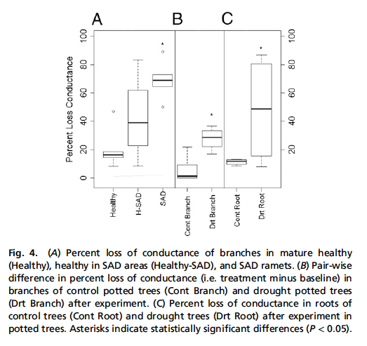 The best part of the paper was linking the degree of water stress to the severity of damage (shown above). Their metric was the reduction in plant water potential relative to the water potential at which conductance is reduced by 50%. The greater the severity of water stress, the greater the damage.